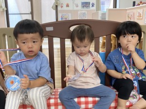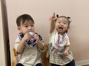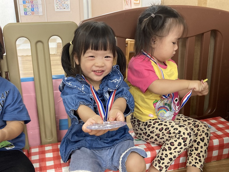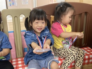 各クラスの先生より、名前を呼ばれて「よく頑張りました♪」とメダルを首にかけてもらうと嬉し、恥ずかしの表情でじっとメダルを見つめる子どもたちでした。