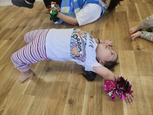 ポップなリズムに合わせ、きらきらポンポンを待って踊り出すりんご組の子ども達。
