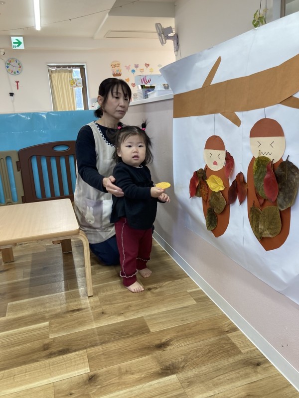 シルエットクイズの後は、「秋には虫さんも葉っぱの洋服を着るんだよ」と模造紙に描かれたミノムシの体に1人ずつ順番に本物の葉っぱを貼ってもらいました。