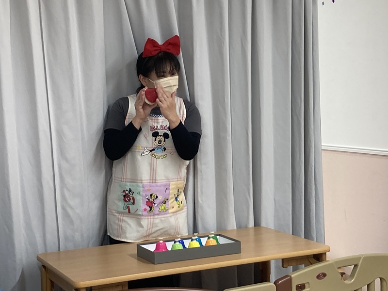 まずは保育士からデスクベル演奏のプレゼントがありました!
