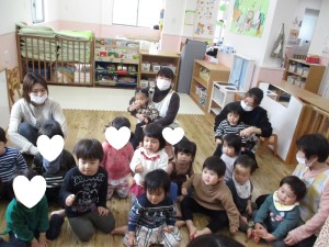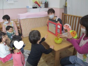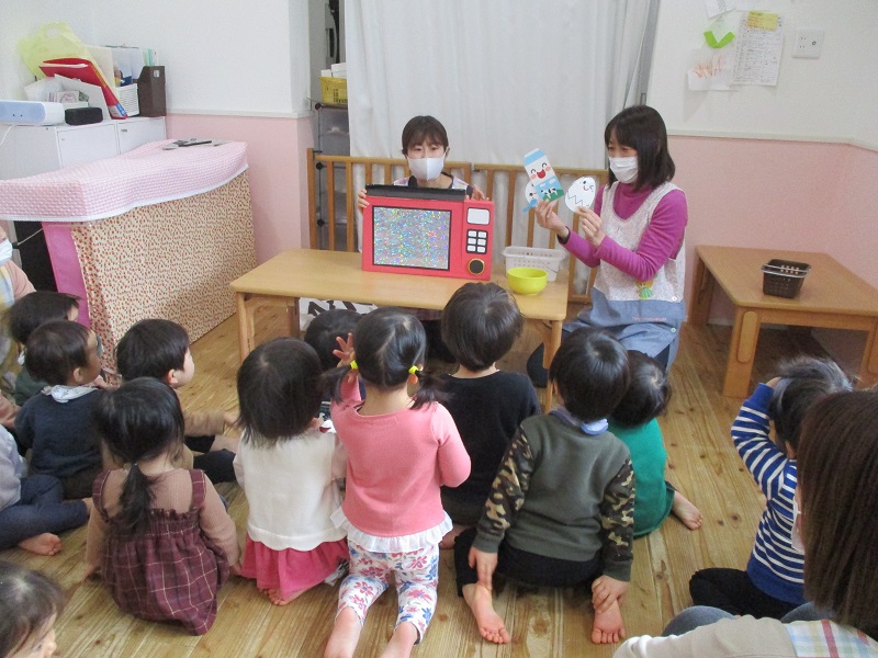 1月のお楽しみ会をしました 1月の「お楽しみ会」は、♪変身ベルトの体操と♪魔法の電子レンジのパネルシアターを見ました!