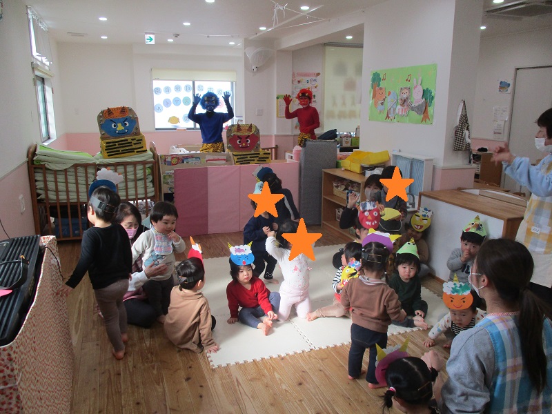 そろ~りそろ~いといつの間にか赤鬼と青鬼が保育室に入ってきていて一緒に鬼のパンツの手遊びを…