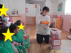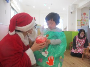大きな声で「ありがとう!」と言えた子、腰が引けながらも手を出してプレゼントを受け取る子、プレゼントよりもサンタさんやトナカイさんが気になりじっと見ている子など、プレゼントを受け取る様子も色々でとても可愛かったです(#^^#)