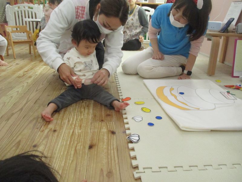 いちご組から果物を選らびパネルに貼りました!担任と一緒に貼るとニコニコ笑ういちご組さんでした♪