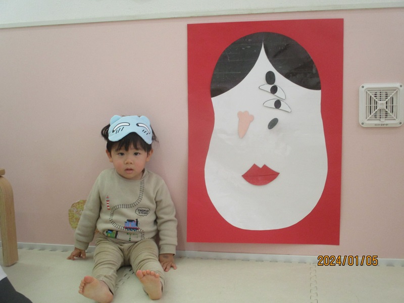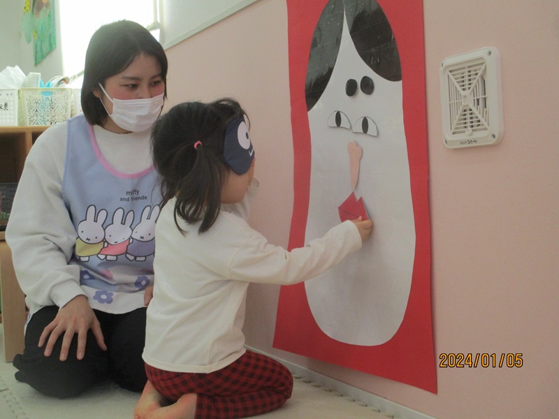 新年お祝い会③ 獅子舞さんとお別れした後はお正月遊びで福笑いとこま回しをしました。
