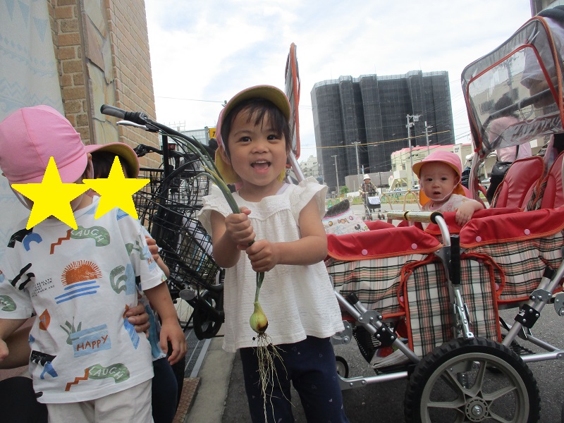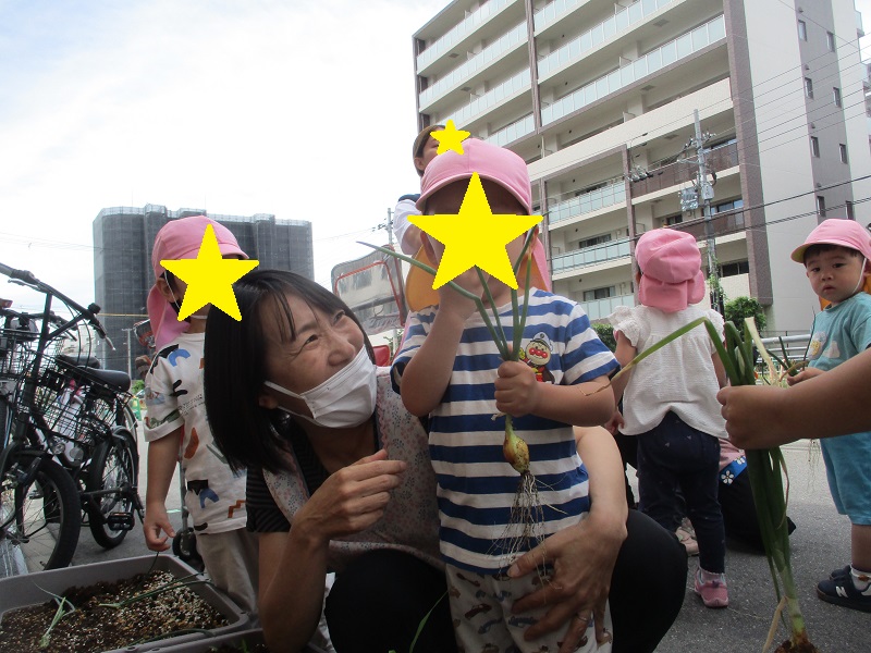 まずはりんご組さんから「うんとこしょ どっこいしょ」の掛け声で葉っぱを引っ張り、あっという間に土の中から玉ねぎが!!