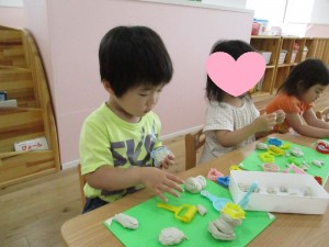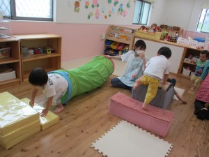 公園では、霧吹きに水を入れ持っていき、子どもたちの近くにシュッシュとかけています。『いやーーー』といいながらもとても嬉しそうに楽しんでいます。