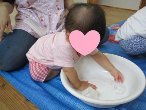 夏ならではの、氷遊びやスライムで遊んでいます。