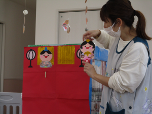 ひな人形には、お雛さまやお内裏様以外にも三人官女や色んな人たちが登場してきます。子ども達が少しでも分かりやすいようにペープシアターを使って見てもらいました。