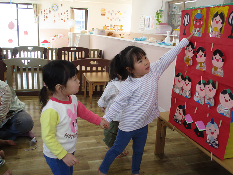 ひなまつりの会では、なぜひな人形をかざるのか、それは"子ども達が健康で元気にすごせますように"とひな人形を飾るのだよとお話をしました。
