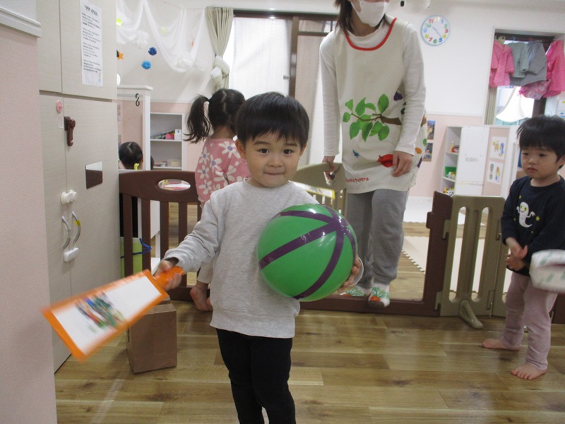 羽子板は牛乳パックで出来ていていますが作りはしっかりとしていて、初めて持った子も保育者のお手本を見てすぐに真似て、「えいっ」「えいっ」とぶら下げた風船(的)に羽子板が当たるまで何度も頑張っていました。
