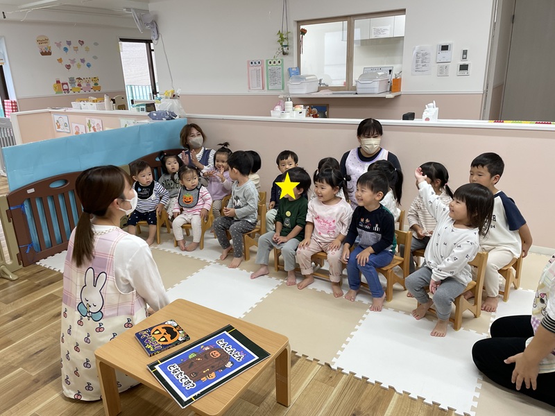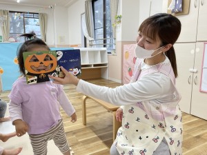 おおかみおとこやフランケンが出てきましたが、可愛いニコニコ笑顔だったので子どもたちも「コンコンコン!」と一緒に掛け声を言いながら楽しんでくれていました♪