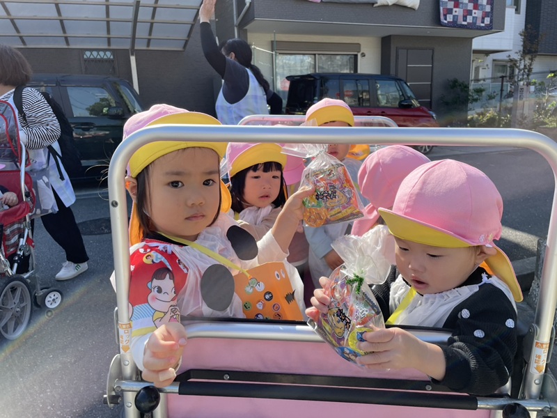 手作りのカバンにお菓子を入れてもらうとニコニコ嬉しそうに、帰り道も入っているか何度も確認する姿がとっても可愛らしかったですよ。
