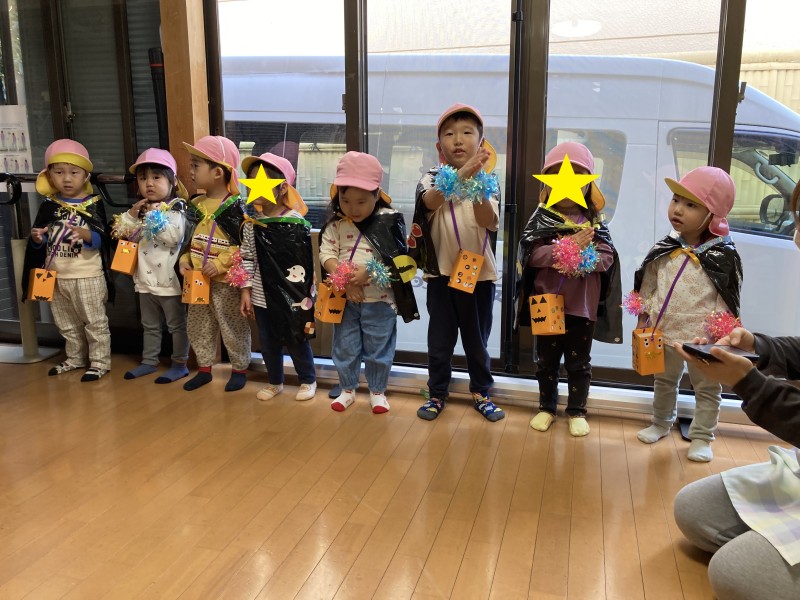いざ、施設に入るとたくさんの方で出迎えてもらい。驚きで泣いてしまう子もいましたが、施設の方がハロウィンを装飾を付けてくださったり子どもたちが喜んでくれるようにと、アンパンマンのお歌を掛けてくださり子どもたちも少しずつ雰囲気に慣れてくれていました☺