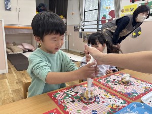お昼寝が終わり、午後のおやつはみんなでケーキ作り!