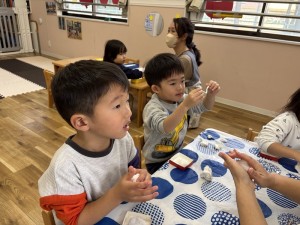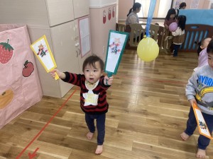その後はお正月の手遊び!「グーチョキパーでなにつくろう?」のお正月バージョンで子どもたちもすぐに真似してやってくれていましたよ!